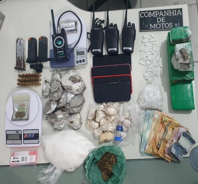 Em buscas nos cômodos da residência, foi apreendido três carregadores de pistola calibre .40, 23 munições de mesmo calibre intactas, uma mira laser para arma de fogo, um aparelho bloqueador de sinal GPS, três balanças de precisão, três rádios comunicadores, quatro smartphones, maconha (1823 gramas), cocaína (1014 gramas), crack (348 gramas) e oito unidades de ecstasy.