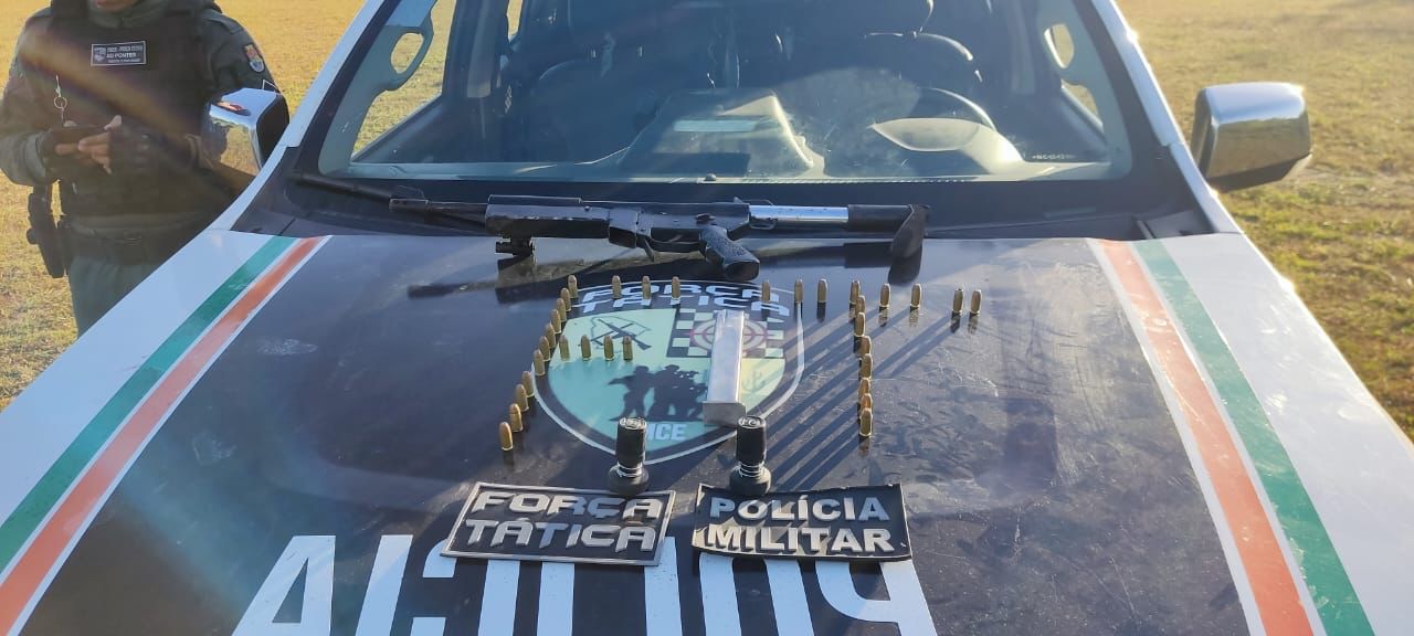 de um campo de futebol. A composição solicitou reforço da viatura de Força Tática e foram até o local averiguar, quando se depararam com quatro homens que, ao notarem a presença da polícia, empreenderam fuga adentrando em um matagal. Em buscas no perímetro, foi apreendido o armamento abandonado pelos suspeitos.O material foi deixado à disposição da justiça na Delegacia Metropolitana de Caucaia.