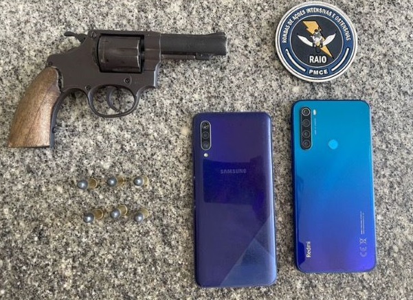 A polícia recuperou o celular da vítima uma arma calibre 32, dinheiro e outros celulares e mandou os dois para o 32ºDP.